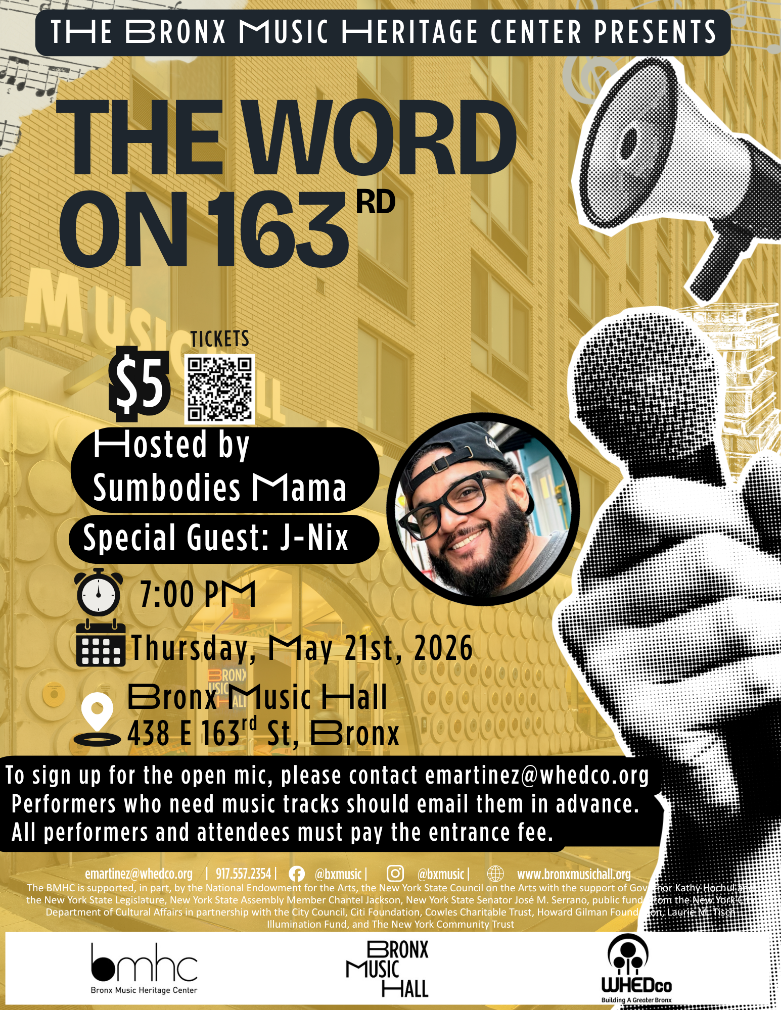 Spoken word open mic hosted by Bronx poet Sumbodies Mama. It is open to all ages, to poetry and spoken word in any language and also for solo music performances. Special Guest: J-Nix